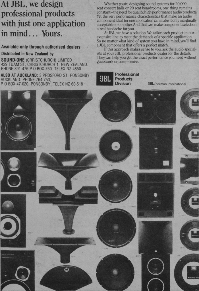 At JBL, we design professional products with just one application in mind... Yours. Available only through authorised dealers Distributed in New Zealand by SOUND-ONE (CHRISTCHURCH) LIMITED;" 429 TUAM ST, CHRISTCHURCH 1, NEW ZEALAND. PHONE 891-476 P 0 BOX 760. TELEX NZ 4850 ALSO AT AUCKLAND: 3 PROSFORD ST. PONSONBY AUCKLAND. PHONE 764-753, P 0 BOX 47-020, PONSONBY. TELEX NZ 60-518 : Whether you're designing sound systems for 20,000 seat concert halls or 20 seat boardrooms, one thing remains constant—the need for quality, high performance audio products. Yet the very performance characteristics that make an audio ■"''. component ideal for one application can make it only marginally acceptable for another. And that can make component selection j a real headache for you. At JBL, we have a solution. We tailor each product in our extensive line to meet the demands of a specific application. So no matter what kind of system you have in mind, you'll find a JBL component that offers a perfect match.. If this approach makes sense to you, ask the audio specialists at your JBL professional products dealer for the details. They can help you get the exact performance you need without guesswork or compromise. Professional I Products Division harman international '"Jm m m S k vm* v w ■ © 0 - ■?: G n