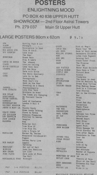 POSTERS ENLIGHTNING MOOD PO BOX 40 838 UPPER HUTT SHOWROOM — 2nd Floor Astral Towers Ph. 279 037 Main St Upper Hutt LARGE POSTERS 80cm x 62cm $ 9,75 AHA Hunting High & Low ’AUHAUS Strength k. CUBES Kind oi Magic ■ . nir H *“S n nr. Belalugccls Is Dead CHRIS REA Beach Tour . 86 BIG COM-BY I® BAD UD “ SEED ROCk ‘ n ‘ RoU AQltta SIG COUNTRY look Away NOLTING STONES Decembers Children BUNNYMFX 1?® T, REM ' Life ® rlch p «S M " t OUBBYMEM Ocean Ram BUN DMC Raising Hell run,e n. ? lnf ' * Lear ” RUSH Grace Under Press. CHRIS DE BURGH The etaeay SADE The Promise . CLAoH Bontlj "= Calling Tour . 86 CRliipg' 05 ™' 1 ' 0 -7°= 2er SEX PISTOLS Never Kind Bollocks CRAMPS Off the Bene SIMPLE XIJDS Onca „ , Tlne ~„T S Zlf ! SIMPLY RED Picture Book CULT She Sells Sanctuary SIOUISIE Hyeana CURE Lets G to Bed Tinderbox Pornography SMITHS The Queen Is dead Boys Don't Cry . SPRIBGSTEBB Live at Madison Sq. Head on the Door STING Dream Blue Turtles Standing on a Beach TALKING HEADS Stop Making Sense „ '■ Phantasmagoria ' Once In a Lifetime DIRE STRAITS Love Over Gold True stories 808 DYLAN ?h: th Tmes la .rChangmg SST - £ — PETER “g ABNIEL £ T ° UrßeW Tnlto Prlde GENESIS Land of Confusion Red cv HOUSEXARTINS London 0 Hull 4 . \ Blood Red Sky VEITREY HOUSTOS Pic VATFRUnrc £ I, * C V,°" JESUS 8 MARY CH. Psycho Candy THE ¥HO qJdrophenU GRACE JOBES 11.7. W”. VOODESTOPS Giant tp, GRACK JOHES Slave to Rythtn P4n! ynnvr n * . JOY DIVISION Unknown Pleasures w TOP w ° FlreS LED ZEPPELIN Stairway to heaven 7 ° P Afterburner JOHN LENNON ■ Imagine u Sacred Heart MADONNA Ang Hol y fiver Material Girl FOREIGNER / St LIM True Blue LP ' ;™ ¥ “ EF J 8 ’ 111 Pr °vTrue Blue SGL 1801 XAIMI Brain Damage 'B3 Like a Virgin LP * orla Slavery ‘B4 . MARILLION Market Sq. Heroes \ Live after Death Misplaced Childhoods JETHRO TULL “ T *’ e Carden Party Live RRIEST ]-bo 808 MARLEY Legend Asylum Uprising ' r Lick it Up MEATLOAF Bat out of Hell Anlmallse XISSIOH Cods Own Medicine MEATLOAF .Bad Attitude BEV ORDER ' Low Life METALLICA Master of Puppets FISK FLOYD Dark side of Moon Kill ea All . The Vail ' MOBSTERS OF ROCK 'B6 . PSYCKADELIC FURS Midnight MOTLEY CRUE Theatre of Pain Shout at the Devil OZZY OSBOURBE Ultimate Sin Tour '' . RUSH Tour ’B3 P&P 1-4 POSTERS $2.20 VHITESI.IKE Slide it in P&P. 5-8 POSTERS $4.40 WHOLESALE ENQUIRIES WELCOME