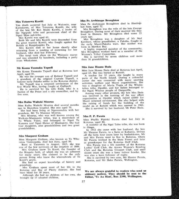 Mrs Jane Hoana Ihaia Mrs Jane Hoana Ihaia died at Rotorua last April, aged 65. She was buried at Rotoiti. A teacher for 35 years, she taught in many parts of the North Island. During a colourful career she was connected with many sporting activities, welfare and Maori organisations. She was a daughter of Maria Topia of the Whakatohea tribe, Opotiki, and her father belonged to the Ngati Whatua people of Dargaville. Among many other projects, the late Mrs Ihaia was involved in the running of the war effort organisation at Opotiki which raised £1000 for Maori returned servicement. She also helped with the raising of funds for the building of the model pa at Rotoiti which was opened in 1960. She is survived by her husband, Mr Peter Ihaia.