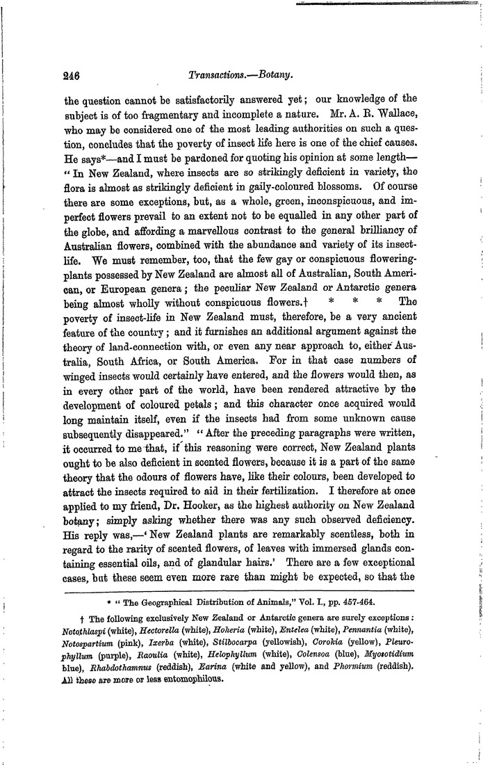 the question cannot be satisfactorily answered yet; our knowledge of the subject is of too fragmentary and incomplete a nature. Mr. A. R. Wallace, who may be considered one of the most leading authorities on such a question, concludes that the poverty of insect life here is one of the chief causes. He says* “The Geographical Distribution of Animals,” Vol. I., pp. 457–464.—and I must be pardoned for quoting his opinion at some length—“In New Zealand, where insects are so strikingly deficient in variety, the flora is almost as strikingly deficient in gaily-coloured blossoms. Of course there are some exceptions, but, as a whole, green, inconspicuous, and imperfect flowers prevail to an extent not to be equalled in any other part of the globe, and affording a marvellous contrast to the general brilliancy of Australian flowers, combined with the abundance and variety of its insect-life. We must remember, too, that the few gay or conspicuous flowering-plants possessed by New Zealand are almost all of Australian, South American, or European genera; the peculiar New Zealand or Antarctic genera being almost wholly without conspicuous flowers.‡ The following exclusively New Zealand or Antarctic genera are surely exceptions: Notothlaspi (white), Hectorella (white), Hoheria (white), Entelea (white), Pennantia (white), Notospartium (pink), Ixerba (white), Stilbocarpa (yellowish), Corokia (yellow), Pleurophyllum (purple), Raoulia (white), Helophyllum (white), Colensoa (blue), Myosotidium blue), Rhabdothamnus (reddish), Earina (white and yellow), and Phormium (reddish). All these are more or less entomophilous. * * * The poverty of insect-life in New Zealand must, therefore, be a very ancient feature of the country; and it furnishes an additional argument against the theory of land-connection with, or even any near approach to, either Australia, South Africa, or South America. For in that case numbers of winged insects would certainly have entered, and the flowers would then, as in every other part of the world, have been rendered attractive by the development of coloured petals; and this character once acquired would long maintain itself, even if the insects had from some unknown cause subsequently disappeared.” “After the preceding paragraphs were written, it occurred to me that, if this reasoning were correct, New Zealand plants ought to be also deficient in scented flowers, because it is a part of the same theory that the odours of flowers have, like their colours, been developed to attract the insects required to aid in their fertilization. I therefore at once applied to my friend, Dr. Hooker, as the highest authority on New Zealand botany; simply asking whether there was any such observed deficiency. His reply was,—‘New Zealand plants are remarkably scentless, both in regard to the rarity of scented flowers, of leaves with immersed glands containing essential oils, and of glandular hairs.’ There are a few exceptional cases, but these seem even more rare than might be expected, so that the