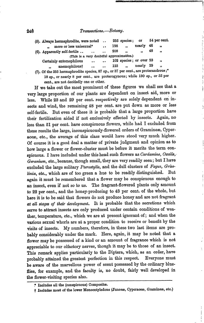 (5). Always hermaphrodite, were noted 235 species; or 54 per cent. " more or less unisexual* * Includes all the (conspicuous) Compositæ. 198 " nearly 46 " (6). Apparently self-fertile 208 " " 48 " (This is a very doubtful approximation.) Certainly entomophilous 102 species; or over 23 " " anemophilous† ‡ Includes most of the lower Monocotyledons (Junceæ, Cyperaceæ, Gramineæ, etc.) 123 " nearly 29 " (7). Of the 235 hermaphrodite species, 87 sp., or 37 per cent., are proterandrous;* * 18 sp., or nearly 8 per cent., are proterogynous; while 130 sp., or 55 per cent., are not decidedly one or other. If we take out the most prominent of these figures we shall see that a very large proportion of our plants are dependent on insect aid, more or less. While 23 and 29 per cent. respectively are solely dependent on insects and wind, the remaining 48 per cent. are put down as more or less self-fertile. But even of these it is probable that a large proportion have their fertilization aided if not exclusively effected by insects. Again, no less than 51 per cent. have conspicuous flowers, while had I excluded from these results the large, inconspicuously-flowered orders of Gramineæ, Cyperaceæ, etc., the average of this class would have stood very much higher. Of course it is a good deal a matter of private judgment and opinion as to how large a flower or flower-cluster must be before it merits the term conspicuous. I have included under this head such flowers as Cardamine, Oxalis, Geranium, etc., because, though small, they are very readily seen; but I have excluded the large solitary Pterostylis, and the dull clusters of Fagus, Griselinia, etc., which are of too green a hue to be readily distinguished. But again it must be remembered that a flower may be conspicuous enough to an insect, even if not so to us. The fragrant-flowered plants only amount to 22 per cent., and the honey-producing to 43 per cent. of the whole, but here it is to be said that flowers do not produce honey and are not fragrant at all stages of their development. It is probable that the secretions which serve to attract insects are only produced under certain conditions of weather, temperature, etc., which we are at present ignorant of; and when the various sexual whorls are at a proper condition to receive or benefit by the visits of insects. My numbers, therefore, in these two last items are probably considerably under the mark. Here, again, it may be noted that a flower may be possessed of a kind or an amount of fragrance which is not appreciable to our olfactory nerves, though it may be to those of an insect. This remark applies particularly to the Diptera, which, as an order, have probably attained the greatest perfection in this respect. Everyone must be aware of the marvellous power of scent possessed by the ordinary blue-flies, for example, and the faculty is, no doubt, fairly well developed in the flower-visiting species also.