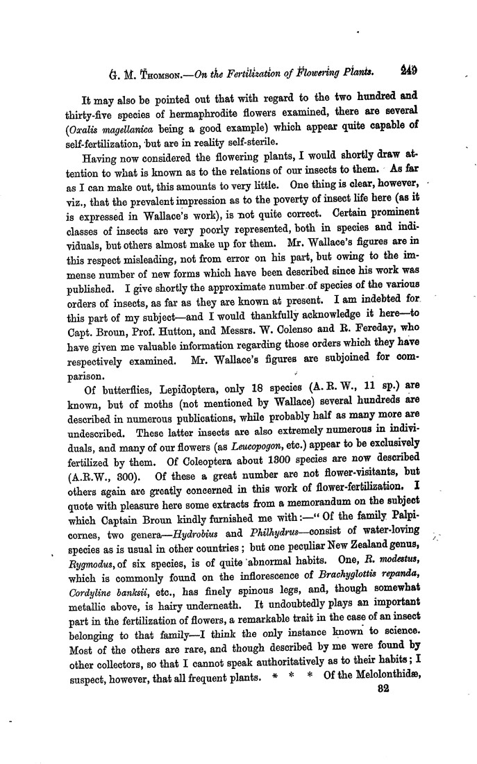 Art. XXXIII.—On the Fertilization, etc., of New Zealand Flowering Plants. By George M. Thomson, F.L.S. [Read before the Otago Institute, 11th May, 1880.] Plate X. The collection and examination of the flowering plants of this colony have occupied a good deal of my spare time during the last four or five years, and have enabled me to accumulate some materials for working out the various modes of fertilization which are to be found among them. These materials, even when made the most of, are however only sufficient to show how little is really known of this most interesting subject. In giving, then, the results of my imperfect observations, I do so in the form of a preliminary notice, which I trust will pave the way for fuller and more detailed work in the future. This subject of the fertilization of our flowering plants is necessarily so mixed up with the question of our insect fauna that I am led to unite the two to a certain extent, and show the relationship which exists between them. At the risk of repeating to many here information which they already possess, I will—for the benefit of the uninitiated—shortly explain the phenomena of fertilization of flowering plants, as far as external manifestations are concerned. The sexual organs of such plants are contained in those parts of the flower termed, respectively, stamens and pistil. A stamen consists essentially of a 1-, 2-, or 4-celled cavity, called the anther (which may or may not be mounted on a stalk, or filament), and which contains, usually, a vast number of small, variously-shaped, cellular bodies, the pollen-grains, which either are themselves, or contain, the male fertilizing element. The pistil consists of a 1- or more-celled cavity, the ovary, containing ovules, in which the female element occurs. External to the ovary is a glandular portion (of extremely various shapes in various plants), termed the stigma, which at a certain stage of the development of the flower becomes viscid, and so fitted to catch and retain the pollen-grains. In some cases the stigma is on a stalk, the style, in others it is sessile. The pollen-grains, when in contact with and apparently excited by the viscid secretion of the stigma, produce very slender tubes which grow down and penetrate the ovary, and finding their way to the micropyles (or apertures)