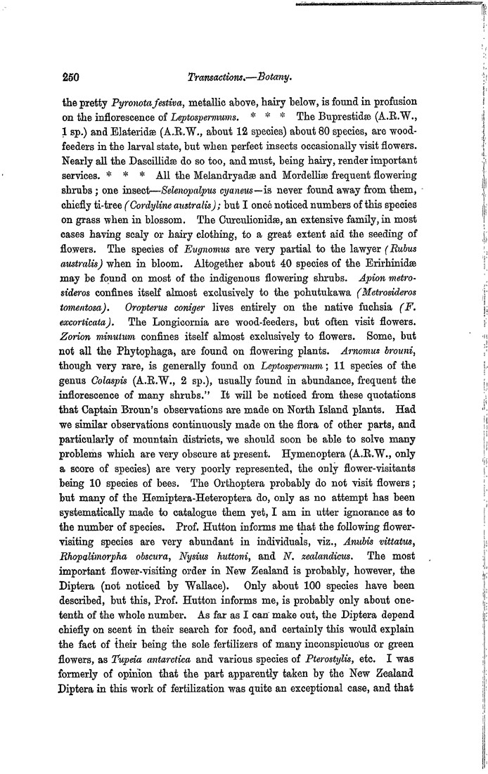the pretty Pyronota festiva, metallic above, hairy below, is found in profusion on the inflorescence of Leptospermums. * * * The Buprestidæ (A.R.W., 1 sp.) and Elateridæ (A.R.W., about 12 species) about 80 species, are wood-feeders in the larval state, but when perfect insects occasionally visit flowers. Nearly all the Dascillidæ do so too, and must, being hairy, render important services. * * * All the Melandryadæ and Mordelliæ frequent flowering shrubs; one insect—Selenopalpus cyaneus—is never found away from them, chiefly ti-tree (Cordyline australis); but I once noticed numbers of this species on grass when in blossom. The Curculionidæ, an extensive family, in most cases having scaly or hairy clothing, to a great extent aid the seeding of flowers. The species of Eugnomus are very partial to the lawyer (Rubus australis) when in bloom. Altogether about 40 species of the Erirhinidæ may be found on most of the indigenous flowering shrubs. Apion metrosideros confines itself almost exclusively to the pohutukawa (Metrosideros tomentosa). Oropterus coniger lives entirely on the native fuchsia (F. excorticata) The Longicornia are wood-feeders, but often visit flowers. Zorion minutum confines itself almost exclusively to flowers. Some, but not all the Phytophaga, are found on flowering plants. Arnomus brouni, though very rare, is generally found on Leptospermum; 11 species of the genus Colaspis (A.R.W., 2 sp.), usually found in abundance, frequent the inflorescence of many shrubs.” It will be noticed from these quotations that Captain Broun's observations are made on North Island plants. Had we similar observations continuously made on the flora of other parts, and particularly of mountain districts, we should soon be able to solve many problems which are very obscure at present. Hymenoptera (A.R.W., only a score of species) are very poorly represented, the only flower-visitants being 10 species of bees. The Orthoptera probably do not visit flowers; but many of the Hemiptera-Heteroptera do, only as no attempt has been systematically made to catalogue them yet, I am in utter ignorance as to the number of species. Prof. Hutton informs me that the following flower-visiting species are very abundant in individuals, viz., Anubis vittatus, Rhopalimorpha obscura, Nysius huttoni, and N. zealandicus. The most important flower-visiting order in New Zealand is probably, however, the Diptera (not noticed by Wallace). Only about 100 species have been described, but this, Prof. Hutton informs me, is probably only about one-tenth of the whole number. As far as I can make out, the Diptera depend chiefly on scent in their search for food, and certainly this would explain the fact of their being the sole fertilizers of many inconspicuous or green flowers, as Tupeia antarctica and various species of Pterostylis, etc. I was formerly of opinion that the part apparently taken by the New Zealand Diptera in this work of fertilization was quite an exceptional case, and that