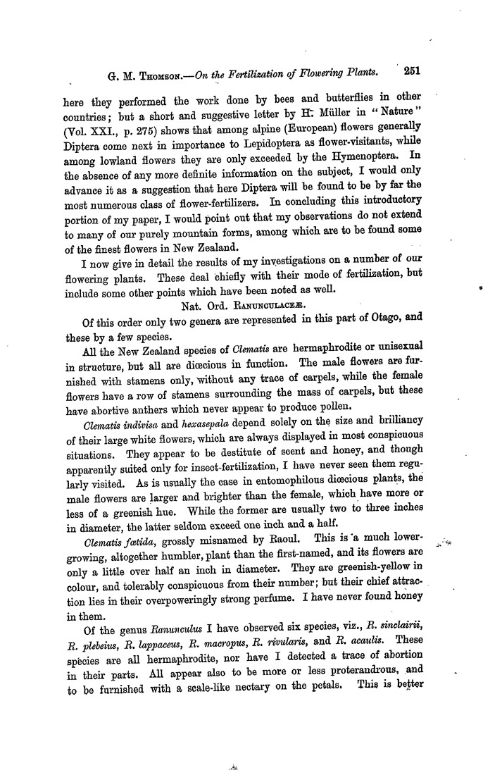 here they performed the work done by bees and butterflies in other countries; but a short and suggestive letter by H. Müller in “Nature” (Vol. XXI., p. 275) shows that among alpine (European) flowers generally Diptera come next in importance to Lepidoptera as flower-visitants, while among lowland flowers they are only exceeded by the Hymenoptera. In the absence of any more definite information on the subject, I would only advance it as a suggestion that here Diptera will be found to be by far the most numerous class of flower-fertilizers. In concluding this introductory portion of my paper, I would point out that my observations do not extend to many of our purely mountain forms, among which are to be found some of the finest flowers in New Zealand. I now give in detail the results of my investigations on a number of our flowering plants. These deal chiefly with their mode of fertilization, but include some other points which have been noted as well. Nat. Ord. Ranunculaceæ. Of this order only two genera are represented in this part of Otago, and these by a few species. All the New Zealand species of Clematis are hermaphrodite or unisexual in structure, but all are diœcious in function. The male flowers are furnished with stamens only, without any trace of carpels, while the female flowers have a row of stamens surrounding the mass of carpels, but these have abortive anthers which never appear to produce pollen. Clematis indivisa and hexasepala depend solely on the size and brilliancy of their large white flowers, which are always displayed in most conspicuous situations. They appear to be destitute of scent and honey, and though apparently suited only for insect-fertilization, I have never seen them regularly visited. As is usually the case in entomophilous diœcious plants, the male flowers are larger and brighter than the female, which have more or less of a greenish hue. While the former are usually two to three inches in diameter, the latter seldom exceed one inch and a half. Clematis fœtida, grossly misnamed by Raoul. This is a much lower-growing, altogether humbler, plant than the first-named, and its flowers are only a little over half an inch in diameter. They are greenish-yellow in colour, and tolerably conspicuous from their number; but their chief attraction lies in their overpoweringly strong perfume. I have never found honey in them. Of the genus Ranunculus I have observed six species, viz., R. sinclairii, R. plebeius, R. lappaceus, R. macropus, R. rivularis, and R. acaulis. These species are all hermaphrodite, nor have I detected a trace of abortion in their parts. All appear also to be more or less proterandrous, and to be furnished with a scale-like nectary on the petals. This is better