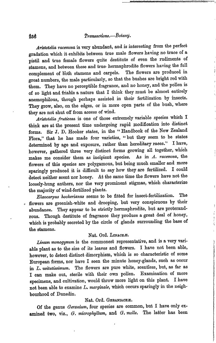 Aristotelia racemosa is very abundant, and is interesting from the perfect gradation which it exhibits between true male flowers having no trace of a pistil and true female flowers quite destitute of even the rudiments of stamens, and between these and true hermaphrodite flowers having the full complement of both stamens and carpels. The flowers are produced in great numbers, the male particularly, so that the bushes are bright red with them. They have no perceptible fragrance, and no honey, and the pollen is of so light and friable a nature that I think they must be almost entirely anemophilous, though perhaps assisted in their fertilization by insects. They grow, also, on the edges, or in more open parts of the bush, where they are not shut off from access of wind. Aristotelia fruticosa is one of those extremely variable species which I think are at the present time undergoing rapid modification into distinct forms. Sir J. D. Hooker states, in the “Handbook of the New Zealand Flora,” that he has made four varieties, “but they seem to be states determined by age and exposure, rather than hereditary races.” I have, however, gathered three very distinct forms growing all together, which makes me consider them as incipient species. As in A. racemosa, the flowers of this species are polygamous, but being much smaller and more sparingly produced it is difficult to say how they are fertilized. I could detect neither scent nor honey. At the same time the flowers have not the loosely-hung anthers, nor the very prominent stigmas, which characterize the majority of wind-fertilized plants. Elœocarpus hookerianus seems to be fitted for insect-fertilization. The flowers are greenish-white and drooping, but very conspicuous by their abundance. They appear to be strictly hermaphrodite, but are proterandrous. Though destitute of fragrance they produce a great deal of honey, which is probably secreted by the circle of glands surrounding the base of the stamens. Nat. Ord. Linaceæ. Linum monogynum is the commonest representative, and is a very variable plant as to the size of its leaves and flowers. I have not been able, however, to detect distinct dimorphism, which is so characteristic of some European forms, nor have I seen the minute honey-glands, such as occur in L. usitatissimum. The flowers are pure white, scentless, but, as far as I can make out, sterile with their own pollen. Examination of more specimens, and cultivation, would throw more light on this plant. I have not been able to examine L. marginale, which occurs sparingly in the neighbourhood of Dunedin. Nat. Ord. Geraniaceæ. Of the genus Geranium, four species are common, but I have only examined two, viz., G. microphyllum, and G. molle. The latter has been