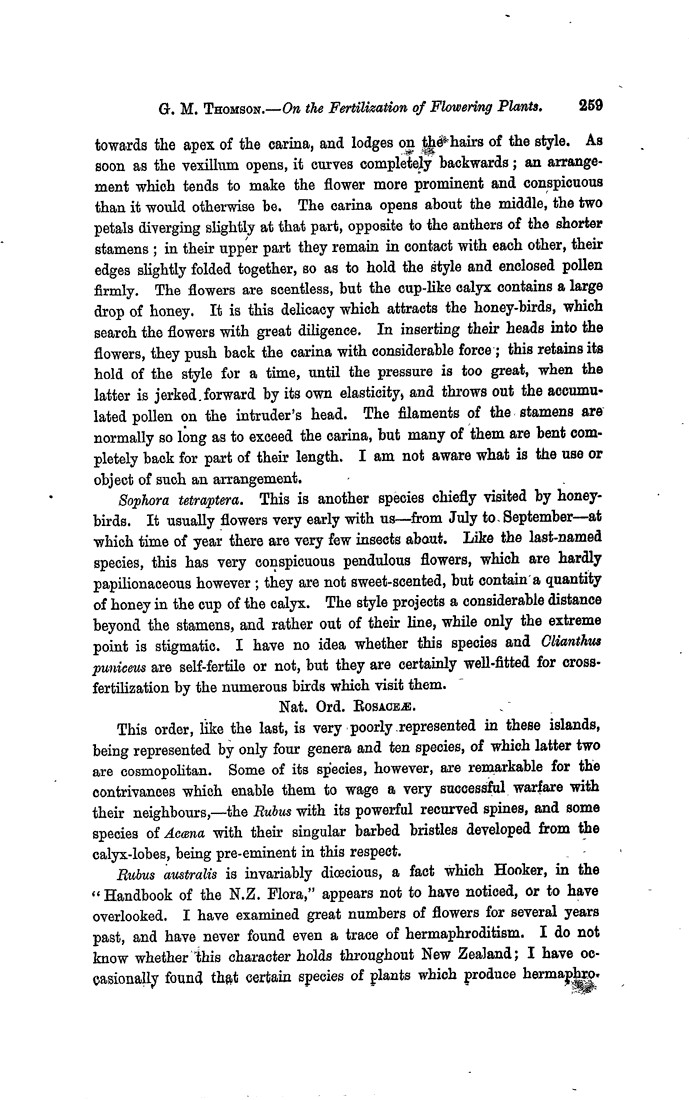 towards the apex of the carina, and lodges on the hairs of the style. As soon as the vexillum opens, it curves completely backwards; an arrangement which tends to make the flower more prominent and conspicuous than it would otherwise be. The carina opens about the middle, the two petals diverging slightly at that part, opposite to the anthers of the shorter stamens; in their upper part they remain in contact with each other, their edges slightly folded together, so as to hold the style and enclosed pollen firmly. The flowers are scentless, but the cup-like calyx contains a large drop of honey. It is this delicacy which attracts the honey-birds, which search the flowers with great diligence. In inserting their heads into the flowers, they push back the carina with considerable force; this retains its hold of the style for a time, until the pressure is too great, when the latter is jerked forward by its own elasticity, and throws out the accumulated pollen on the intruder's head. The filaments of the stamens are normally so long as to exceed the carina, but many of them are bent completely back for part of their length. I am not aware what is the use or object of such an arrangement. Sophora tetraptera. This is another species chiefly visited by honeybirds. It usually flowers very early with us—from July to September—at which time of year there are very few insects about. Like the last-named species, this has very conspicuous pendulous flowers, which are hardly papilionaceous however; they are not sweet-scented, but contain a quantity of honey in the cup of the calyx. The style projects a considerable distance beyond the stamens, and rather out of their line, while only the extreme point is stigmatic. I have no idea whether this species and Clianthus puniceus are self-fertile or not, but they are certainly well-fitted for cross-fertilization by the numerous birds which visit them. Nat. Ord. Rosaceæ. This order, like the last, is very poorly represented in these islands, being represented by only four genera and ten species, of which latter two are cosmopolitan. Some of its species, however, are remarkable for the contrivances which enable them to wage a very successful warfare with their neighbours,—the Rubus with its powerful recurved spines, and some species of Acœna with their singular barbed bristles developed from the calyx-lobes, being pre-eminent in this respect. Rubus australis is invariably diœcious, a fact which Hooker, in the “Handbook of the N.Z. Flora,” appears not to have noticed, or to have overlooked. I have examined great numbers of flowers for several years past, and have never found even a trace of hermaphroditism. I do not know whether this character holds throughout New Zealand; I have occasionally found that certain species of plants which produce hermaphro-