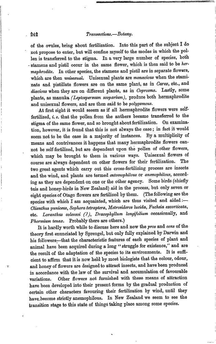 of the ovules, bring about fertilization. Into this part of the subject I do not propose to enter, but will confine myself to the modes in which the pollen is transferred to the stigma. In a very large number of species, both stamens and pistil occur in the same flower, which is then said to be her maphrodite. In other species, the stamens and pistil are in separate flowers, which are then unisexual. Unisexual plants are monœcious when the staminate and pistillate flowers are on the same plant, as in Carex, etc., and diœcious when they are on different plants, as in Coprosma. Lastly, some plants, as manuka (Leptospermum scoparium), produce both hermaphrodite and unisexual flowers, and are then said to be polygamous. At first sight it would seeem as if all hermaphrodite flowers were self fertilized, i. e. that the pollen from the anthers became transferred to the stigma of the same flower, and so brought about fertilization. On examination, however, it is found that this is not always the case; in fact it would seem not to be the case in a majority of instances. By a multiplicity of means and contrivances it happens that many hermaphrodite flowers cannot be self-fertilized, but are dependent upon the pollen of other flowers, which may be brought to them in various ways. Unisexual flowers of course are always dependent on other flowers for their fertilization. The two great agents which carry out this cross-fertilizing process are insects and the wind, and plants are termed entomophilous or anemophilous, according as they are dependent on one or the other agency. Some birds (chiefly tuis and honey-birds in New Zealand) aid in the process, but only seven or eight species of Otago flowers are fertilized by them. (The following are the species with which I am acquainted, which are thus visited and aided:—Clianthus puniceus, Sophora tetraptera, Metrosideros lucida, Fuchsia excorticata, etc. Loranthus colensoi (?), Dracophyllum longifolium occasionally, and Phormium tenax. Probably there are others.) It is hardly worth while to discuss here and now the pros and cons of the theory first enunciated by Sprengel, but only fully explained by Darwin and his followers—that the characteristic features of each species of plant and animal have been acquired during a long “struggle for existence,” and are the result of the adaptation of the species to its environments. It is sufficient to affirm that it is now held by most biologists that the colour, odour, and honey of flowers are designed to attract insects, and have been produced in accordance with the law of the survival and accumulation of favourable variations. Other flowers not furnished with these means of attraction have been developed into their present forms by the gradual production of certain other characters favouring their fertilization by wind, until they have become strictly anemophilous. In New Zealand we seem to see the transition stage to this state of things taking place among some species.