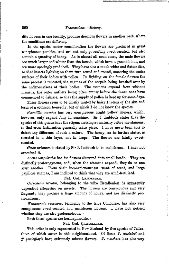 dite flowers in one locality, produce diœcious flowers in another part, where the conditions are different. In the species under consideration the flowers are produced in great conspicuous panicles, and are not only powerfully sweet-scented, but also contain a quantity of honey. As in almost all such cases, the male flowers are much larger and whiter than the female, which have a greenish hue, and are more sparingly produced. They have also a much wider and flatter disc, so that insects lighting on them turn round and round, smearing the under surfaces of their bodies with pollen. In lighting on the female flowers the same process is repeated, the stigmas of the carpels being brushed over by the under-surfaces of their bodies. The stamens expand from without inwards, the outer anthers being often empty before the inner ones have commenced to dehisce, so that the supply of pollen is kept up for some days. These flowers seem to be chiefly visited by hairy Diptera of the size and form of a common house-fly, but of which I do not know the species. Potentilla anserina has very conspicuous bright yellow flowers, which, however, only expand fully in sunshine. Sir J. Lubbock states that the species of this genus have the stigma arriving at maturity before the stamens, so that cross-fertilization generally takes place. I have never been able to detect any difference of such a nature. The honey, as he further states, is secreted in a thin layer, not in drops. The flowers are faintly sweet-scented. Geum urbanum is stated by Sir J. Lubbock to be melliferous. I have not examined it. Acœna sanguisorbœ has its flowers clustered into small heads. They are distinctly protorogynous, and, when the stamens expand, they do so one after another. From their inconspicuousness, want of scent, and large papillose stigmas, I am inclined to think that they are wind-fertilized. Nat. Ord. Saxifrageæ. Carpodetus serratus, belonging to the tribe Escallonieæ, is apparently dependent altogether on insects. The flowers are conspicuous and very fragrant; they produce a large amount of honey, and are distinctly proterandrous. Weinmannia racemosa, belonging to the tribe Cunonieæ, has also very conspicuous sweet-scented and melliferous flowers. I have not noticed whether they are also proterandrous. Both these species are hermaphrodite. Nat. Ord. Crassulaceæ. This order is only represented in New Zealand by five species of Tillœa, three of which occur in this neighbourhood. Of these T. sinclairii and T. verticillaris have extremely minute flowers. T. moschata has also very
