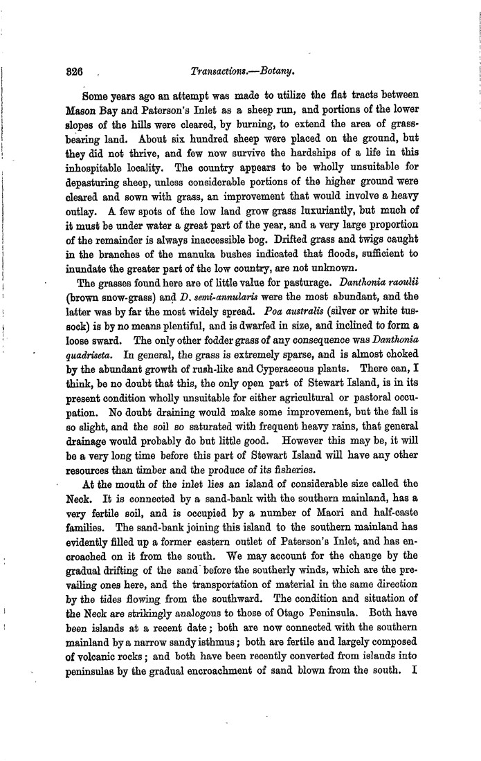 Some years ago an attempt was made to utilize the flat tracts between Mason Bay and Paterson's Inlet as a sheep run, and portions of the lower slopes of the hills were cleared, by burning, to extend the area of grass-bearing land. About six hundred sheep were placed on the ground, but they did not thrive, and few now survive the hardships of a life in this inhospitable locality. The country appears to be wholly unsuitable for depasturing sheep, unless considerable portions of the higher ground were cleared and sown with grass, an improvement that would involve a heavy outlay. A few spots of the low land grow grass luxuriantly, but much of it must be under water a great part of the year, and a very large proportion of the remainder is always inaccessible bog. Drifted grass and twigs caught in the branches of the manuka bushes indicated that floods, sufficient to inundate the greater part of the low country, are not unknown. The grasses found here are of little value for pasturage. Danthonia raoulii (brown snow-grass) and D. semi-annularis were the most abundant, and the latter was by far the most widely spread. Poa australis (silver or white tussock) is by no means plentiful, and is dwarfed in size, and inclined to form a loose sward. The only other fodder grass of any consequence was Danthonia quadriseta. In general, the grass is extremely sparse, and is almost choked by the abundant growth of rush-like and Cyperaceous plants. There can, I think, be no doubt that this, the only open part of Stewart Island, is in its present condition wholly unsuitable for either agricultural or pastoral occupation. No doubt draining would make some improvement, but the fall is so slight, and the soil so saturated with frequent heavy rains, that general drainage would probably do but little good. However this may be, it will be a very long time before this part of Stewart Island will have any other resources than timber and the produce of its fisheries. At the mouth of the inlet lies an island of considerable size called the Neck. It is connected by a sand-bank with the southern mainland, has a very fertile soil, and is occupied by a number of Maori and half-caste families. The sand-bank joining this island to the southern mainland has evidently filled up a former eastern outlet of Paterson's Inlet, and has encroached on it from the south. We may account for the change by the gradual drifting of the sand before the southerly winds, which are the prevailing ones here, and the transportation of material in the same direction by the tides flowing from the southward. The condition and situation of the Neck are strikingly analogous to those of Otago Peninsula. Both have been islands at a recent date; both are now connected with the southern mainland by a narrow sandy isthmus; both are fertile and largely composed of volcanic rocks; and both have been recently converted from islands into peninsulas by the gradual encroachment of sand blown from the south. I