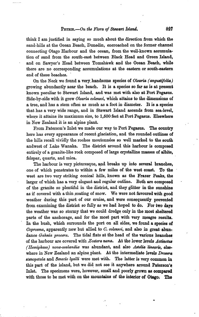 think I am justified in saying so much about the direction from which the sand-hills at the Ocean Beach, Dunedin, encroached on the former channel connecting Otago Harbour and the ocean, from the well-known accumulation of sand from the south-east between Black Head and Green Island, and on Sawyer's Head between Tomahawk and the Ocean Beach, while there are no corresponding accumulations at the eastern or south-eastern end of these beaches. On the Neck we found a very handsome species of Olearia (angustifolia) growing abundantly near the beach. It is a species so far as is at present known peculiar to Stewart Island, and was met with also at Port Pegasus. Side-by-side with it grew Olearia colensoi, which attains to the dimensions of a tree, and has a stem often as much as a foot in diameter. It is a species that has a very wide range, and in Stewart Island ascends from sea-level, where it attains its maximum size, to 1,500 feet at Port Pegasus. Elsewhere in New Zealand it is an alpine plant. From Paterson's Inlet we made our way to Port Pegasus. The country here has every appearance of recent glaciation, and the rounded outlines of the hills recall vividly the roches moutonnées so well marked to the south andwest of Lake Wanaka. The district around this harbour is composed entirely of a granite-like rock composed of large crystalline masses of albite, felspar, quartz, and mica. The harbour is very picturesque, and breaks up into several branches, one of which penetrates to within a few miles of the west coast. To the west are two very striking conical hills, known as the Frazer Peaks, the larger of which has a very elegant and regular outline. Both are composed of the granite so plentiful in the district, and they glitter in the sunshine as if covered with a thin coating of snow. We were not favoured with good weather during this part of our cruise, and were consequently prevented from examining the district so fully as we had hoped to do. For two days the weather was so stormy that we could dredge only in the most sheltered parts of the anchorage, and for the most part with very meagre results. In the bush, which surrounds the port on all sides, we found a species of Coprosma, apparently new but allied to C. colensoi, and also in great abundance Gahnia procera. The tidal flats at the head of the various branches of the harbour are covered with Zostera nana. At the lower levels Actinotus (Hemiphues) novæ-zealandiæ was abundant, and also Astelia linearis, elsewhere in New Zealand an alpine plant. At the intermediate levels Drosera stenopetala and Senecio lyalli were met with. The latter is very common in this part of the island, but we did not see it anywhere around Paterson's Inlet. The specimens were, however, small and poorly grown as compared with those to be met with on the mountains of the interior of Otago. The