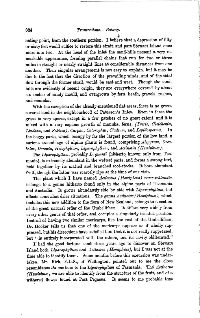 nating point, from the southern portion. I believe that a depression of fifty or sixty feet would suffice to restore this strait, and part Stewart Island once more into two. At the head of the inlet the sand-hills present a very remarkable appearance, forming parallel chains that run for two or three miles in straight or nearly straight lines at considerable distances from one another. Their singular arrangement is not easy to explain, but it may be due to the fact that the direction of the prevailing winds, and of the tidal flow through the former strait, would be east and west. Though the sandhills are evidently of recent origin, they are everywhere covered by about six inches of sandy mould, and overgrown by fern, heath, gravels, rushes, and manuka. With the exception of the already-mentioned flat areas, there is no grass-covered land in the neighbourhood of Paterson's Inlet, Even in these the grass is very sparse, except in a few patches of no great extent, and it is mixed with a very copious growth of manuka, ferns, (Pteris, Gleichenia, Lindsœa, and Schizea), Carpha, Calorophus, Cladium, and Lepidosperma. In the boggy parts, which occupy by far the largest portion of the low land, a curious assemblage of alpine plants is found, comprising Alepyrun, Oreobolus, Donatia, Helophyllum, Liparophyllum, and Actinotus (Hemiphues). The Liparophyllum, probably L. gunnii (hitherto known only from Tasmania), is extremely abundant in the wettest parts, and forms a strong turf, held together by its matted and branched root-stocks. It bore abundant fruit, though the latter was scarcely ripe at the time of our visit. The plant which I have named Actinotus (Hemiphues) novœ-zealandiœ belongs to a genus hitherto found only in the alpine parts of Tasmania and Australia. It grows abundantly side by side with Liparophyllum, but affects somewhat drier situations. The genus Actinotus (Hemiphues), which includes this new addition to the flora of New Zealand, belongs to a section of the great natural order of the Umbelliferæ. It differs very widely from every other genus of that order, and occupies a singularly isolated position. Instead of having two similar mericarps, like the rest of the Umbelliferæ, Dr. Hooker tells us that one of the mericarps appears as if wholly suppressed, but his dissections have satisfied him that it is not really suppressed, but “is entirely incorporated with the others, and its cavity obliterated.” I had the good fortune some three years ago to discover on Stewart Island both Liparophyllum and Actinotus (Hemiphues), but I was not at the time able to identify them. Some months before this excursion was undertaken, Mr. Kirk, F.L.S., of Wellington, pointed out to me the close resemblance the one bore to the Liparophyllum of Tasmania. The Actinotus (Hemiphues) we are able to identify from the structure of the fruit, and of a withered flower found at Port Pegasus. It seems to me probable that