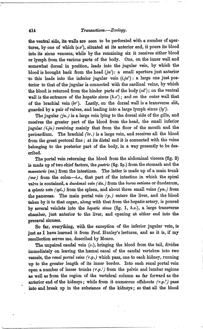 the ventral side, its walls are seen to be perforated with a number of apertures, by one of which (s.v′), situated at its anterior end, it pours its blood into its sinus venosus, while by the remaining six it receives either blood or lymph from the various parts of the body. One, on the inner wall and somewhat dorsal in position, leads into the jugular vein, by which the blood is brought back from the head (ju′): a small aperture just anterior to this leads into the inferior jugular vein (i.ju′): a large one just posterior to that of the jugular is connected with the cardinal veins, by which the blood is returned from the hinder parts of the body (cd′); on the ventral wall is the entrance of the hepatic sinus (h.s′); and on the outer wall that of the brachial vein (br′). Lastly, on the dorsal wall is a transverse slit, guarded by a pair of valves, and leading into a large lymph sinus (ly′). The jugular (ju.) is a large vein lying to the dorsal side of the gills, and receives the greater part of the blood from the head, the small inferior jugular (i.ju) receiving mainly that from the floor of the mouth and the pericardium. The brachial (br.) is a large vein, and receives all the blood from the great pectoral fins; at its distal end it is connected with the veins belonging to the posterior part of the body, in a way presently to be described. The portal vein returning the blood from the abdominal viscera (fig. 2) is made up of two chief factors, the gastric (fig. 2g.) from the stomach and the mesenteric (ms.) from the intestines. The latter is made up of a main trunk (ms′) from the colon—i.e., that part of the intestine in which the spiral valve is contained, a duodenal vein (du.) from the bursa entiana or duodenum, a splenic vein (spl.) from the spleen, and about three small veins (pn.) from the pancreas. The main portal vein (p.) enters the liver, and the blood taken by it to that organ, along with that from the hepatic artery, is poured by several veinlets into the hepatic sinus (fig. 1, h.s.), a large transverse chamber, just anterior to the liver, and opening at either end into the precaval sinuses. So far, everything, with the exception of the inferior jugular vein, is just as I have learned it from Prof. Huxley's lectures, and as it is, if my recollection serves me, described by Monro. The unpaired caudal vein (c.), bringing the blood from the tail, divides immediately on leaving the hæmal canal of the caudal vertebræ into two vessels, the renal portal veins (r.p.) which pass, one to each kidney, running up to the greater length of its inner border. Into each renal portal vein open a number of lesser trunks (r.p.′) from the pelvic and lumbar regions as well as from the region of the vertebral column as far forward as the anterior end of the kidneys; while from it numerous offshoots (r.p.″) pass into and break up in the substance of the kidneys; so that all the blood