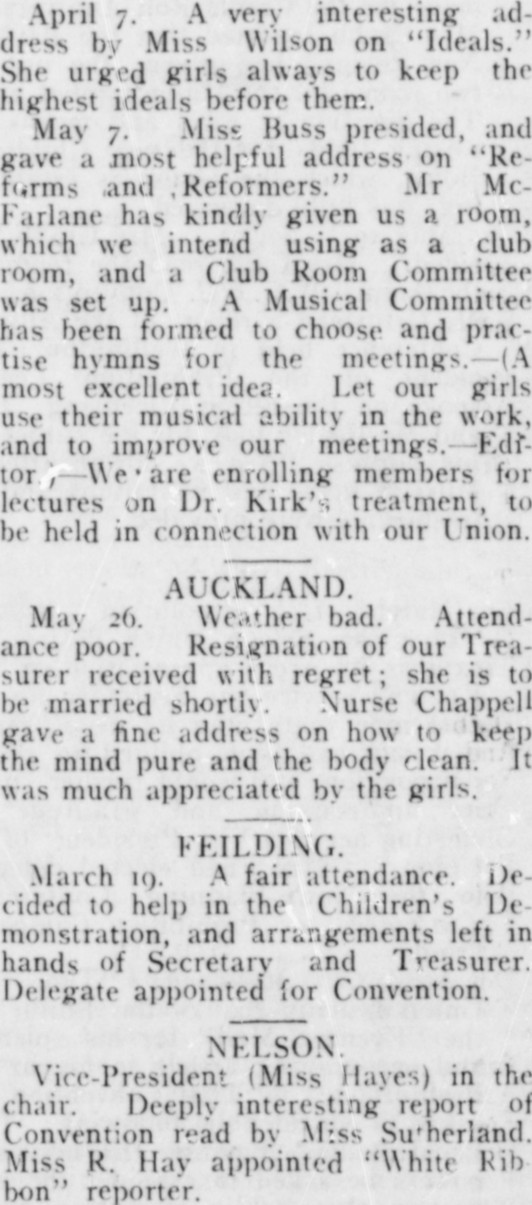 April 7. A very interesting address by Miss Wilson on “Ideals.” She urged girls always to keep the highest ideals before them. May 7. Miss Buss presided, and gave a most helpful address on “Reforms and .Reformers.” Mr McFarlane has kindly given us a room, which we intend using as a club room, and a Club Room Committee was set up. A Musical Committee has been formed to choose and practise hymns for the meetings.—(A most excellent idea. Let our girls use their musical ability in the work, and to improve our meetings.—Edftor —W e *aie enrolling members for lectures on Dr. Kirk’s treatment, to be* held in connection with our Union. AUCKLAND. May 2(). Weather bad. Attendance poor. Resignation of our Treasurer received with regret; she is to be married shortly. Nurse Chappell gave a fine; address on how to keep the mind pure and the body clean. It was much appreciated by the girls. KKILDING. March iq. A fair attendance. Decided to heli> > n the Children’s Demonstration, and arrangements left in hands of Secretary and Treasurer. Delegate appointed for Convention. NELSON Vice-President I Miss Hayes) in the chair. Deeply interesting rej>ort of Convention read by Miss Su'herland. Miss R. Hay appointed “White Rib bon” reporter.
