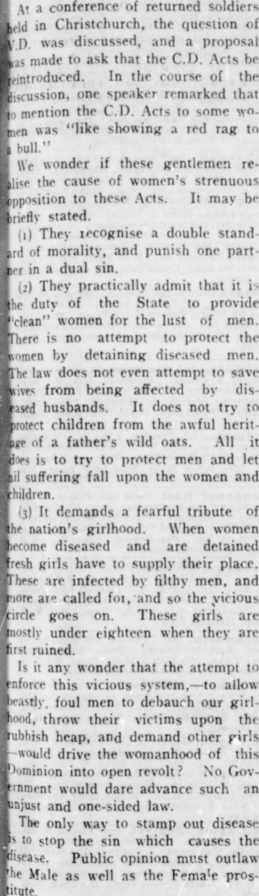 I \t a conference of returned soldiers ,eld in Christchurch, the question of ( - p was discussed, and a proposal >as made to ask that the C.D. Acts be iscussion, one speaker remarked that o mention the C.I). Acts to some wown was “like showing a red raj? to i hull.” \\> wonder if these gentlemen reline the cause of women’s strenuous opposition to these Acts. It may be irieflv stated. (i) They recognise a double stand ird of morality, and punish one partler in a dual sin. (:) They practically admit that it is [he dutv of the State to provide '‘clean” women for the lust of men. There is no attempt to protect the nomrn by detaining diseased men. The law does not even attempt to save *ivf« from being affected by disused husbands. It does not try to jrotect children from the awful heritijje of a father’s wild oats. All it ioes is to try to protect men and let il suffering fall upon the women and Children. I (3) It demands a fearful tribute of Hhe nation's girlhood. When women P>ecome diseased and are detained ■resh girls have to supply their place. ■These are infected by filthy men, and wore ar o called for, and so the Knrrle goes on. These girls are BKnostly under eighteen when they are irst ruined. Is it any wonder that the attempt to enforce this vicious system, —to allow vastly, foul men to debauch our girlhood, throw their victims upon the übbish heap, and demand other girls b-wotild drive the womanhood of this Dominion into open revolt? No Government would dare advance such an unjust and one-sided law. The only way to stamp out disease is to stop the sin which causes the lisease. Public opinion must outlaw lie Male as well as the Female prositute.