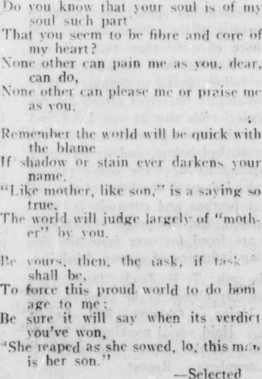 »>,, vou know that your soul is of m\ SO til sin h part Thai you seem to be fibie and core of my heart ? None other can pain me as you, dear, can do, None othei <an please me or piaise mo as yon. Remember the wmld will be quirk with the blame If shadow or stain ever darkens your name. “l ike mother, like son.’’ is a saving so true. The worl 1 will judge laigelv of “mother’’ by you. Be wilts, then, the iask, if fas’* shall be, To force this proud world to do Ihmu age to me; Be sure it will say when its verdict you’ve won, ‘She reaped as she sowed, 10. this m. *. is her son ’’ —Selected