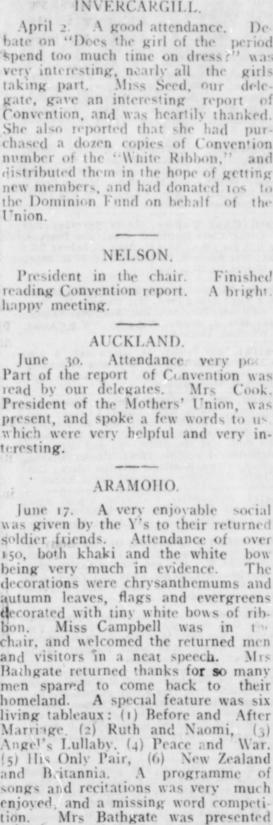 INVERCARGILL. April 2. A good attendance. Do bate on “Does the girl of tin* period 'kpend too much time on dressr’* was very interesting, nearly all the girls taking part. Miss Seed, our delegate, gave an interesting report of Convention, and was heartily thanked. She also reported that she had purchased a dozen copies of ( omen* ion number of the “White Rihlxm," and distributed them in the hope of getting new members, and had donated ins to the Dominion Fund on behalf of tin--1 'nion. NELSON. President in the chair. Finished reading Convention report. A blight. Itappv meeting. ALCKLAND June 30. Attendance very pc Part of the report of Convention was lead by our delegates. Mrs Cook. President of the Mothers’ I’nion, was present, and spoke a few words to which were very helpful and very interesting. AR AM OHO. |une 17. A very enjoyable social yyas given by the Y's to their returned soldier fijends. Attendance of over 150, both khaki and the white bow being very much in evidence. The decorations yvere chrysanthemums and autumn leaves, flags and evergreens <l* corated with tiny white bows of ribbon. Miss Campbell was in t'■ chair, and welcomed the returned men and visitors In a neat speech. Mis Bathgate returned thanks for so many men spared to come hack to their homeland. A special feature y\as six living tableaux: (1) Before and After Marriage. (2) Ruth and Naomi, (3) Angel’* Lullaby. (4) Peace ;nd W ar. <5; Ills Only Pair, (6) New Zealand and B.itannia. A programme of songs arid recitations was very mut h enjoyed, and a missing word conipeti tion. Mrs Bathgate was presented