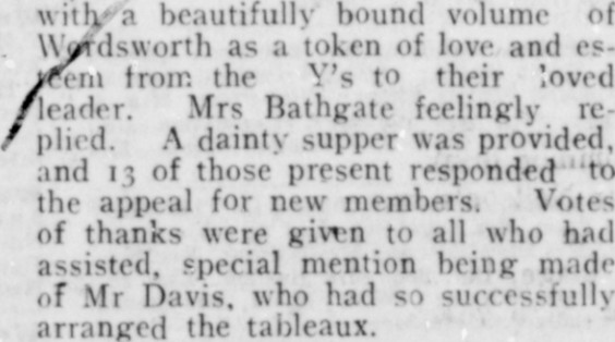 yvitlya beautifully bound volume of Wordsworth as a token of love and esVem troir. the Y’s to their loved /leader. Mrs Bathgate feelingly re- / plied. A dainty supper was provided, and 13 of those present responded to the appeal for new members. Votes of thanks were giwn to all who had assisted, special mention being made of Mr Davis, who had so successfully arranged the tableaux.